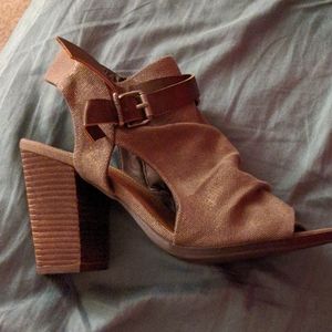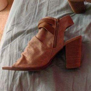 Heeled Tan Shimery Booties. Buckle detail with scrunched look in front. Sort of Shimery cloth materiel with zipped side detail. Never worn outside. Purchased from Nanamacs Boutique