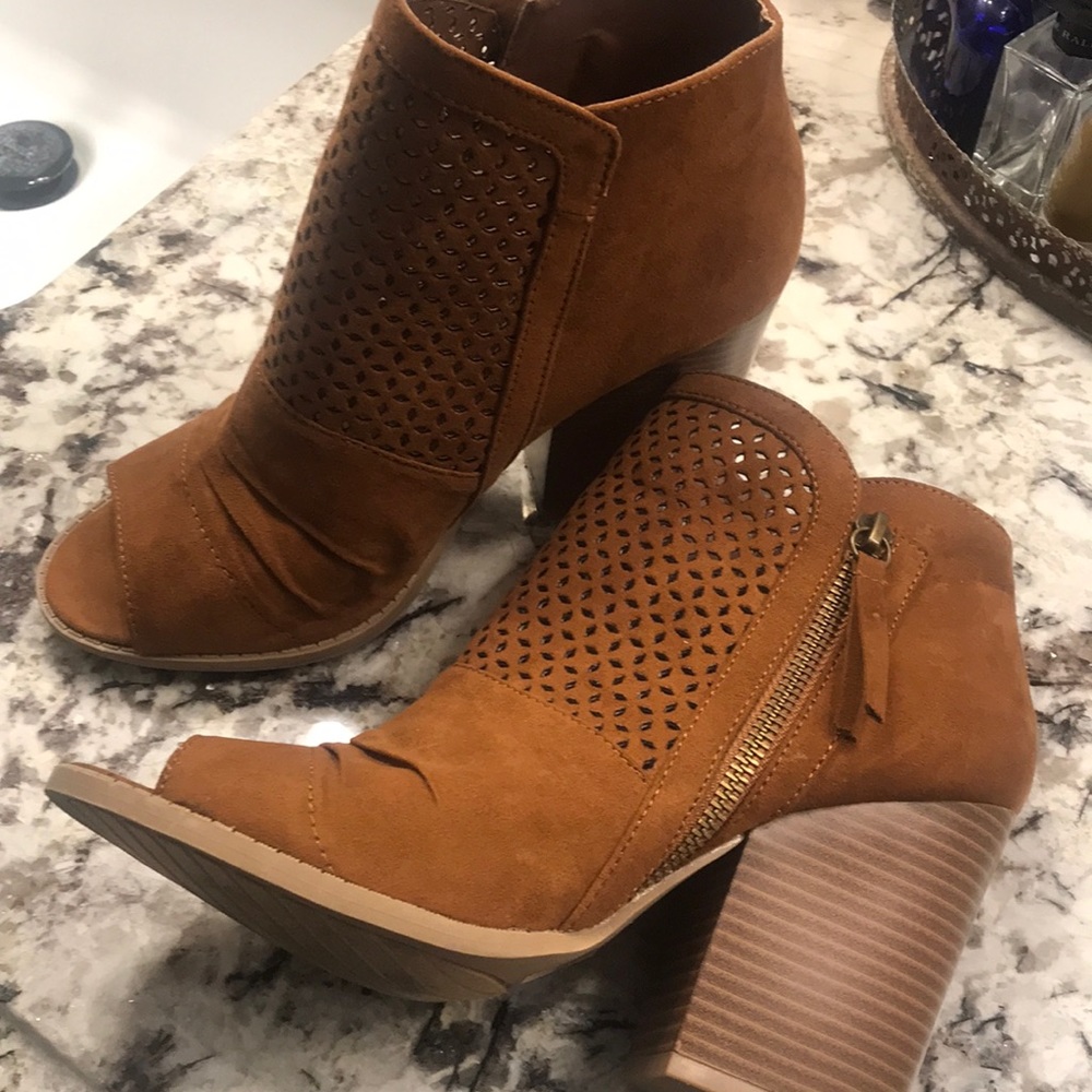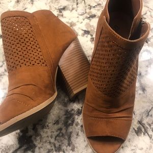 Qupud brand Cognac colored open toe booties EUC worn once. Size 8 1/2. Has 3 1/2” heel.