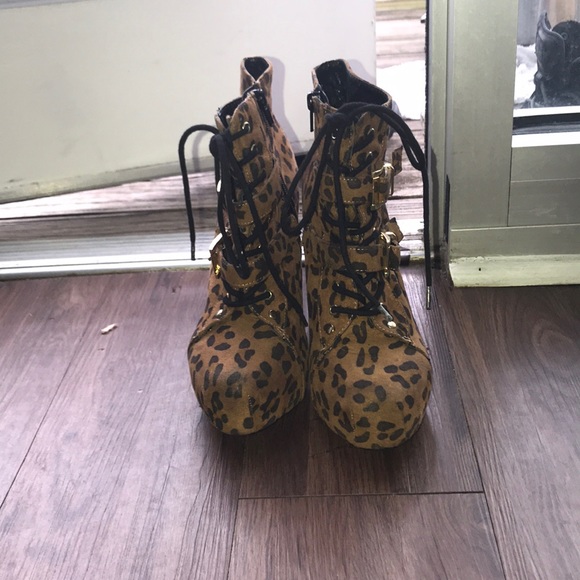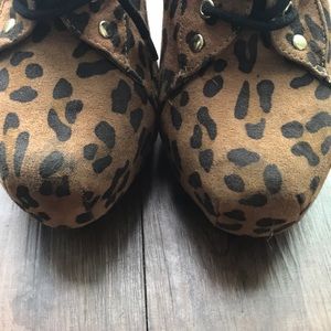 Leopard print booties with buckled design on front and zippers on the side. Very minor discoloration at the point of the shoes. Wore few times until it also was thrown in the bag. A size and half bigger than my norm but the shoes strings helped to keep from slipping off. Received as a gift