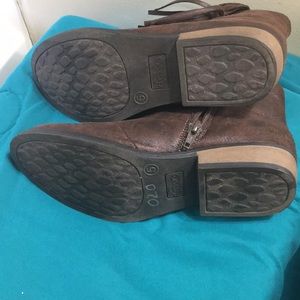 Dynasty Classics distressed textile upper brown color short booties. Has fringes and side zipper. Really cute with mini skirt and short jean jacket. Only worn once and in great condition.
