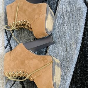 Camel colored faux suede booties. Lace up. Only worn a few times. Good condition, a few scuffs. No box. Size 7.