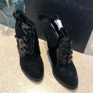 New-in-the-box suede booties, with patent leather accents, just in time for fall!