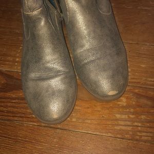 Brushed silver metallic bootie. Round toe with small lifted heel. Very comfy and super cute with jeans. Toes have scuffs.