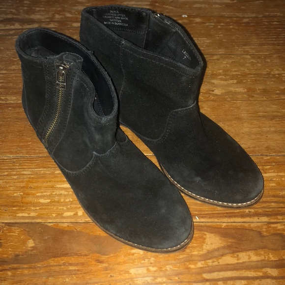 Black suede ankle boots. Approximately 1 to 1.5 inch heel. Side zip can be worn open or not. So cute with blue jeans!