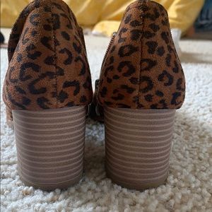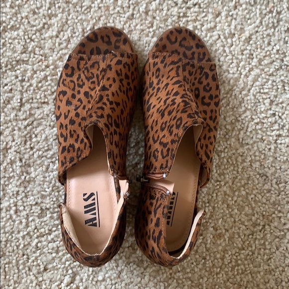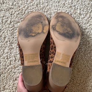 Open toed cheetah booties. Little scuff as pictured on the left shoe. Barely noticeable. Super comfortable and heel about 2.5 inches so not hard to walk in.