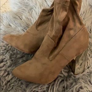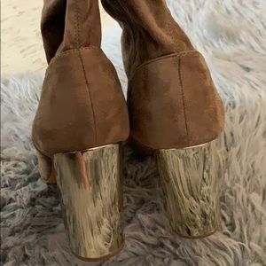 Taupe Booties With Gold Heel. Size Women 10 but run small so may fit like a 9.5 size. Worn once. Good condition.