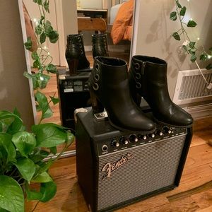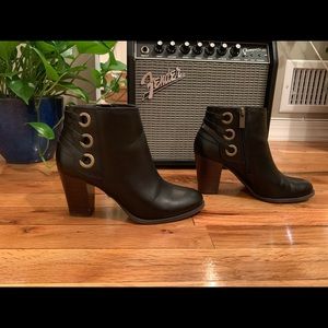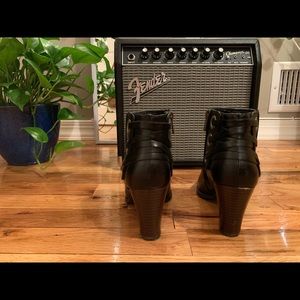 Some wear / Black bootie with laced up back and dark brown heel / Man made upper, fabric lining, man made sock/sole. Zipper on inside of foot / Heel: 3” / Size 7 but fits 6.5