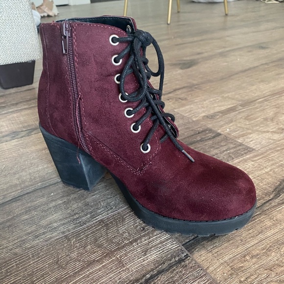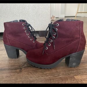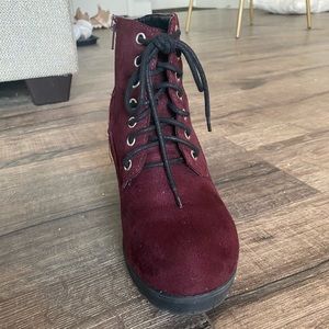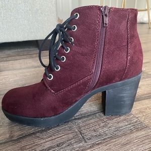 Gently used burgundy faux suede booties. Only worn a handful of times last fall. 3” heels. Side zipper. Lace up front.