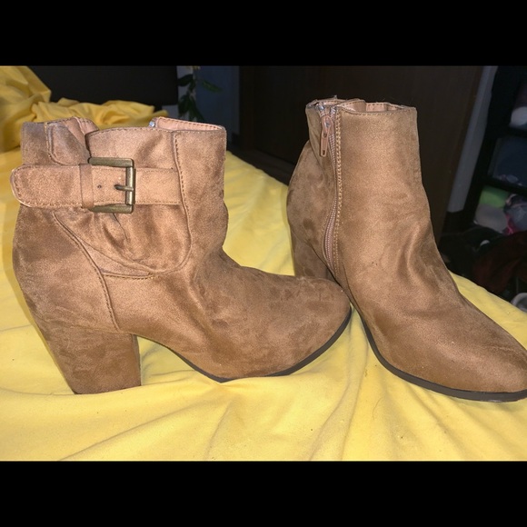 Brown booties. Some scuffs on the bottoms, as shoe in the last picture. Still super cute! Just don't wear anymore. Size 6 1/2. Brown in color.