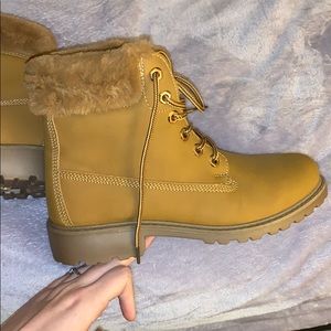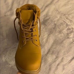 Tan, timberland-like, fuzzy around the top of the boot. Fits smaller than size. Worn only once