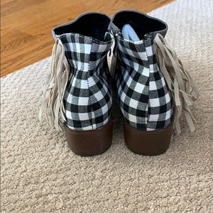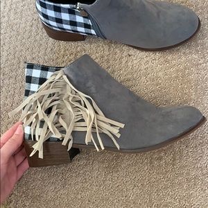 BRAND NEW, NEVER WORN!!! Grey, black and white plaid booties with cream tassels!