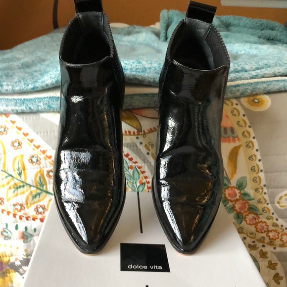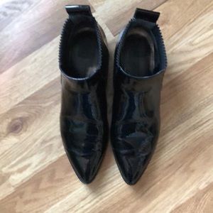 EUC barely worn black patent leather slip on booties with 1 1/2” stacked black heel. All leather inside and out!