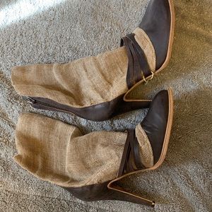 Very avante guarde booties. Italian , leather and leather bottoms , with burlap type material . It’s very interesting, I’ve only worn inside once