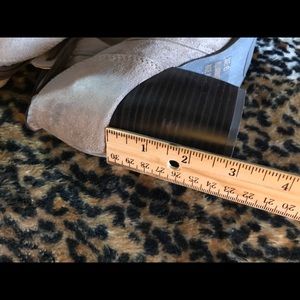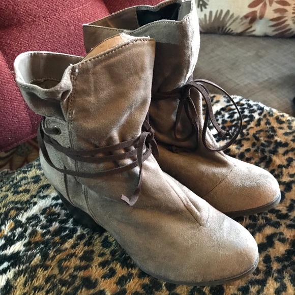 Warm Taupe booties with wrap around ties. Super cute. Worn only once, they were to small.