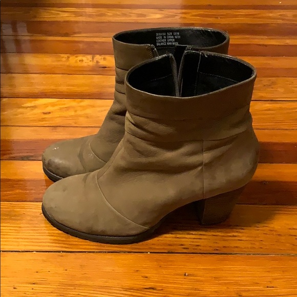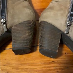 Clarks tan suede booties. These boots have been loved! Small scuff on the right shoe. They’re just a bit too high for me these days while running around after 2 boys! They have stretched out a bit from their snug out of the box 9.5, but if you wear with thicker socks they’re perfect.