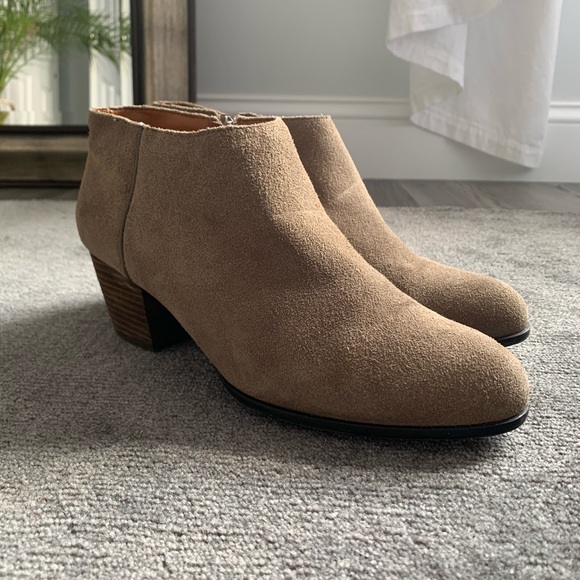 Lucky Brand Booties size 8 in suade. 2” heel. Inside zipper . Hell has some scuffing ( see picture) but overall good pre owned condition.