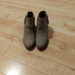 Gray tan booties with buckle detailing on the side.