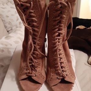 Peep toe pink ankle lace up booties