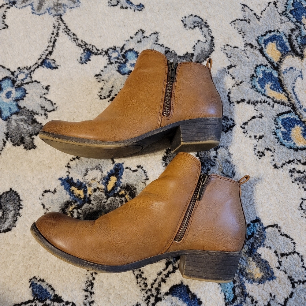Tan zip side booties with low heel. In great used condition. Smoke free pet friendly home. Brand is Dunes.