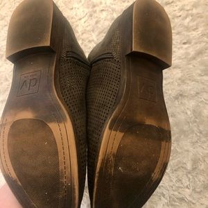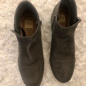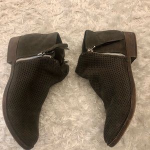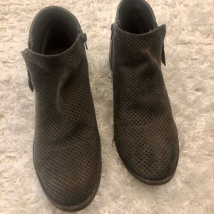 Greyish-green ankle booties with a mesh-like pattern on top and zippers on both sides. Like new, only wore once. No tags. Size 9.