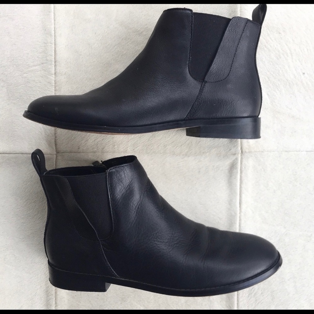 Black genuine leather booties with outside elastic gore and back pull tab and inside zipper. Foam cushion foot bed with rubber sole. Please see photos for signs of wear. Used, but like new. These are size 8B, but they run slightly big for a size 8. They were great with a sock for me. But without a sock just a bit to large for my comfort. If you are a true 8 - 8 1/2, I’d say they’d be perfect!!! 7 1/2 would be just a bit big.