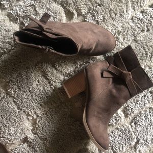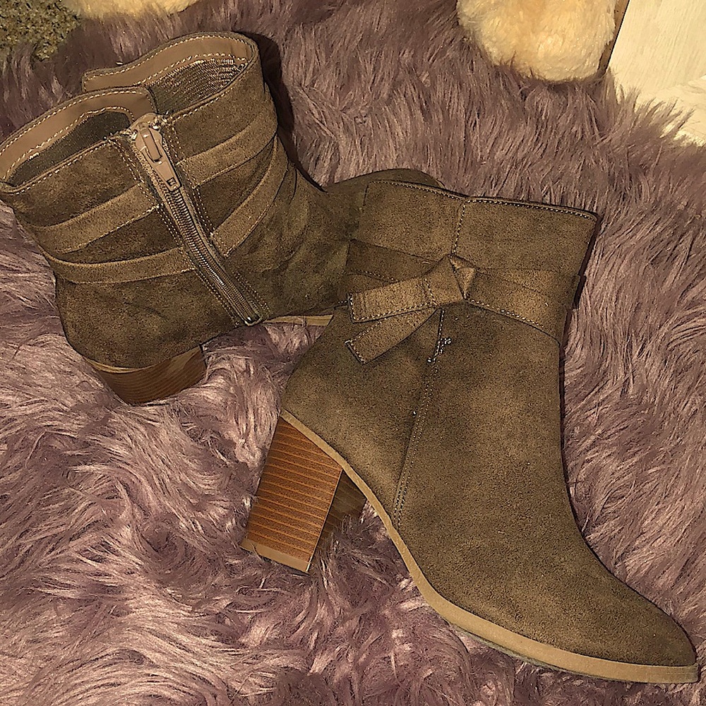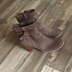 Comfortable booties that would go great with a pair of jeans, leggings, shorts and summer dress . Color is a brown tone and soft material at the touch . No damages , only worn once . Perfect conditions. Booties rise slightly above the ankle. Size 6.5 .