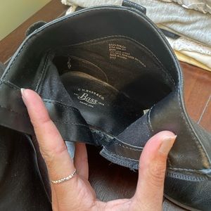 Black Bass leather booties with brown heel, size 8.5. Zip up on the inside with gold button accent. Worn but the heels are toes are still in great shape! Wear on front of left shoe, shown in picture, and recently polished. Favorite booties but recently got surgery and can’t wear anymore :(