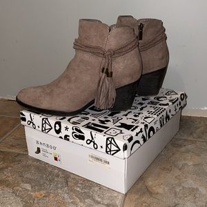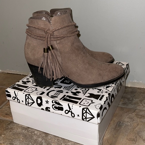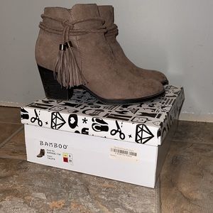 Bamboo taupe, suede like bootie. Wrap around side tassels. Zip up. Chunky heel. Size 9.
