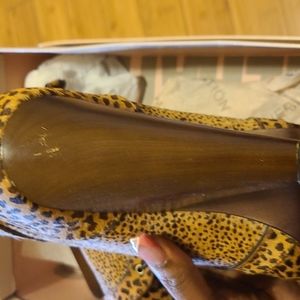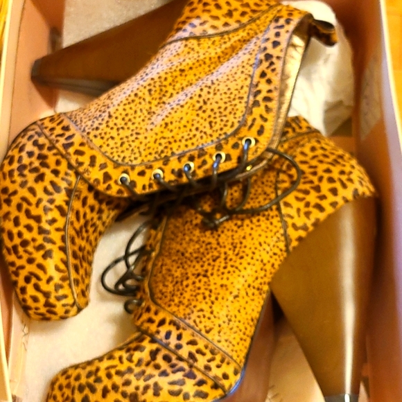 Genuine leather Mohair booties, in animal print with leather laces and all wood heel. Heel is around 4 inches. Booties by BCBG. Small scratch on one heel. Brand new with box, shoe has never been worn. Size 10M