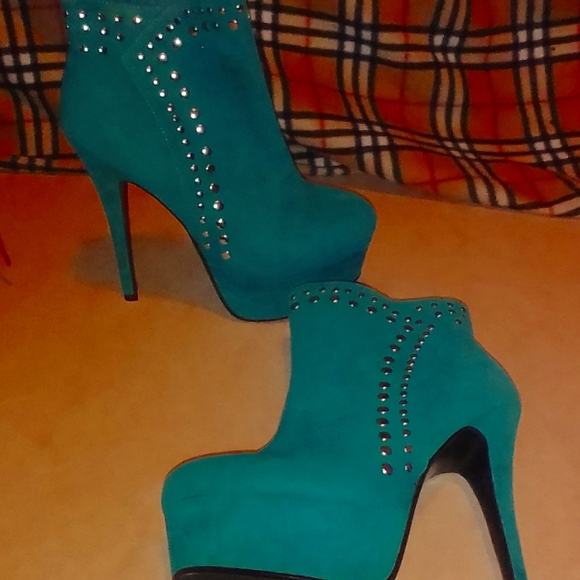 teal suede booties with silver stud embellishments zip on the inside size 7.5/8