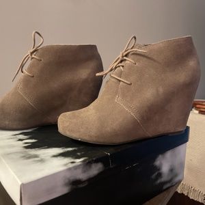 Taupe suede booties. Pascal style. Wedge. Worn twice, great used condition. Stored in original box. True to size.