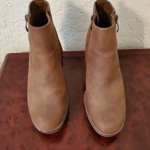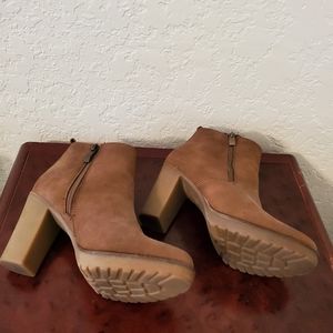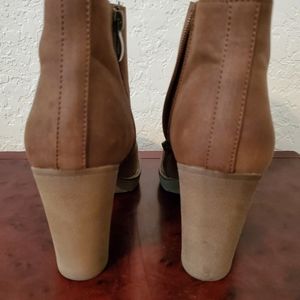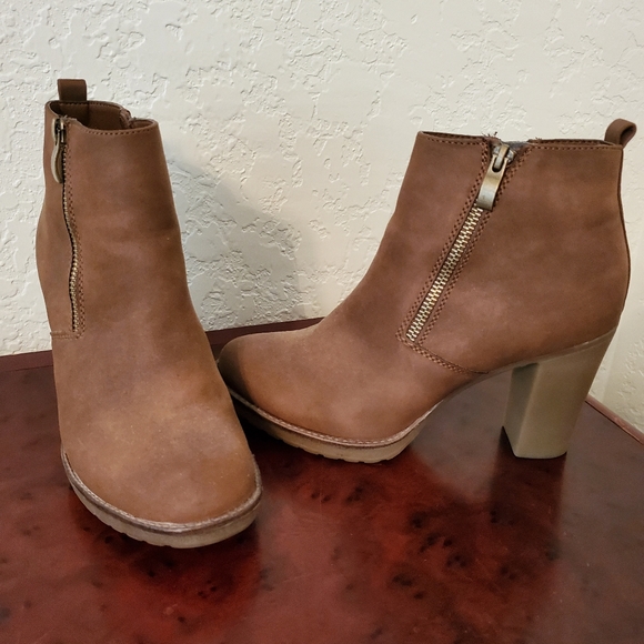 Brown size 7 ankle boot with a 2 inch hill, zipper on both sides.