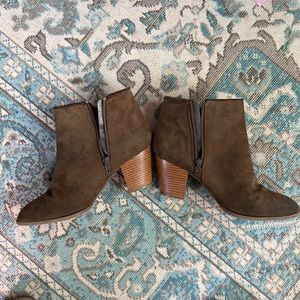Brown suede like boots. Zipper on inside to get into boot. Outside zipper for show.