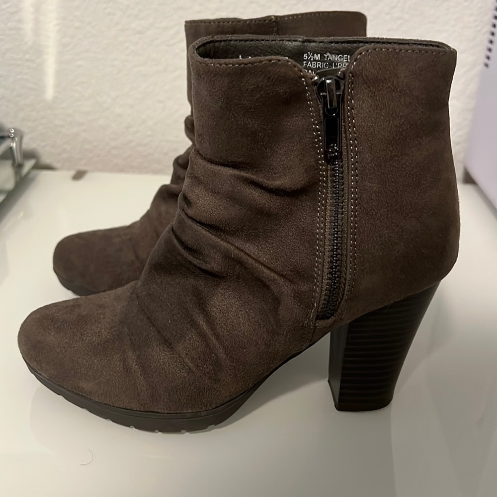 Olive greenish/grayish booties. Worn only twice. Size 5.5 In good condition.