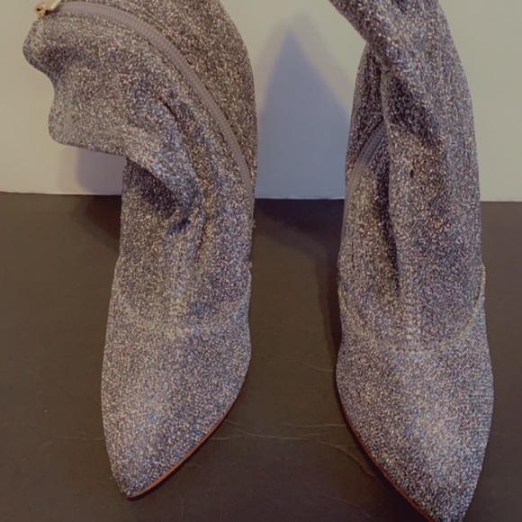 These booties are gorgeous they are shiny in person fabric material shimmer gray worn once US size 6.5 but it’s roomy size 7 can fit this size ego official boots
