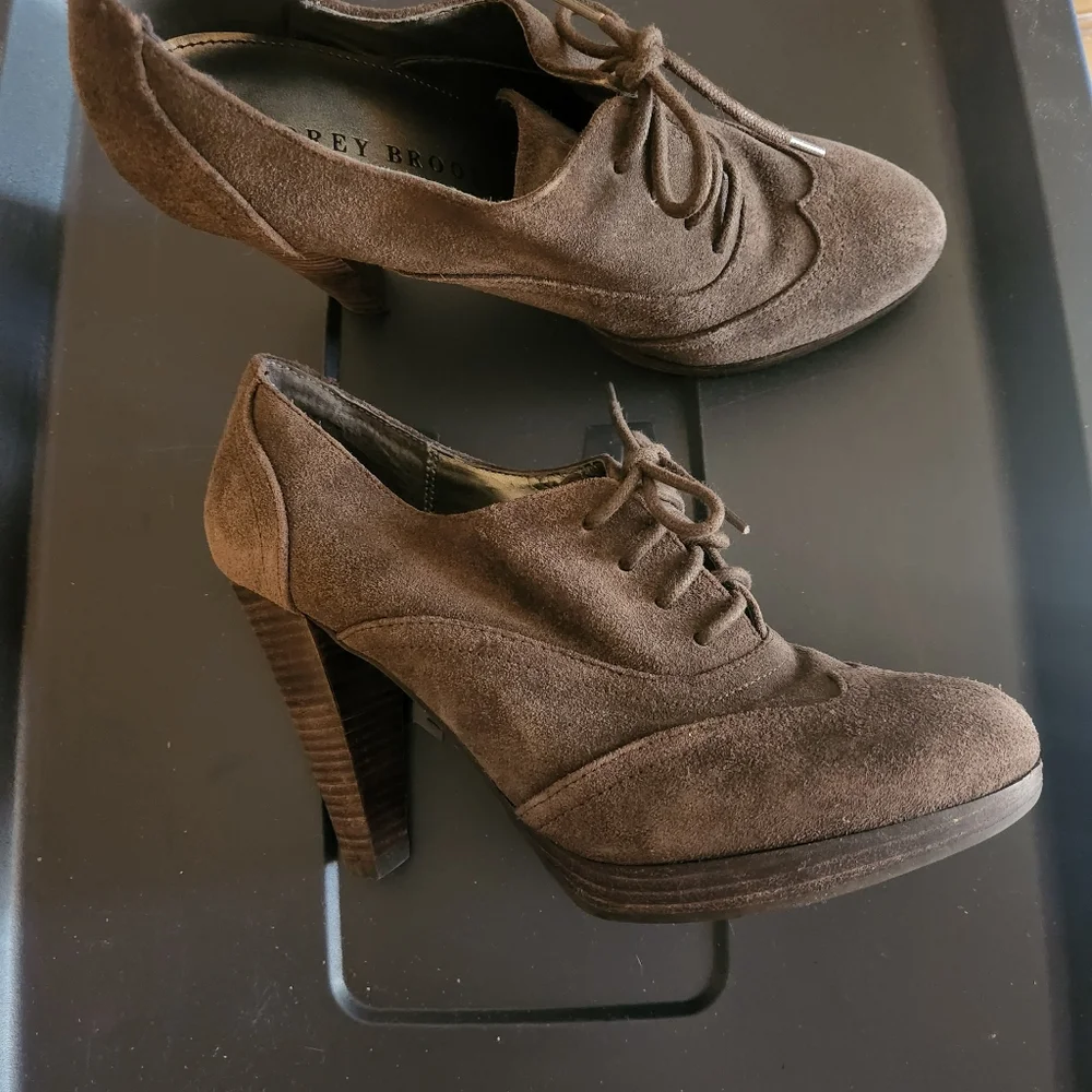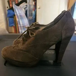 Brown suede vintage cut out detailing lace up booties. Size 8 with 4 inch heel.