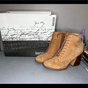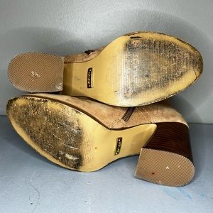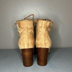 Nude color Ankle Booties, have zipper on the side lace up. Super nice wood heel and a wool feel to them. Comes with box, box is a bit worn out.