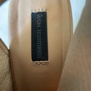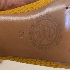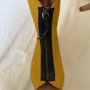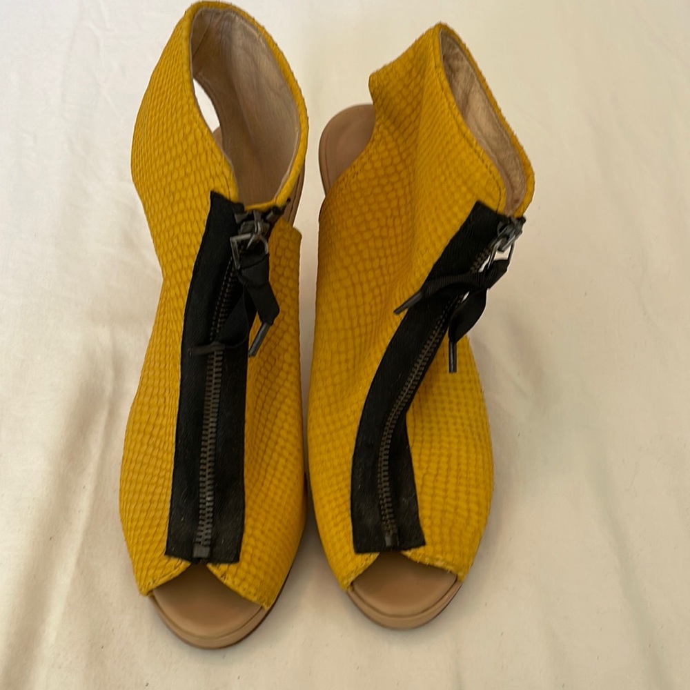 Won Hundred Brand bright yellow printed leather, black zipper, sandal-type booties, with tan platform and heels. The soles do show some wear. The heel is approximately 5”, with about a 3/4” platform. European size 39. These shoes are so fun! I’ve worn them with dresses, jeans, leggings- all kinds of things. I’m sad to have to part with them, I can no longer wear them due to health reasons. So I hope someone else will have fun with them!!