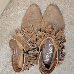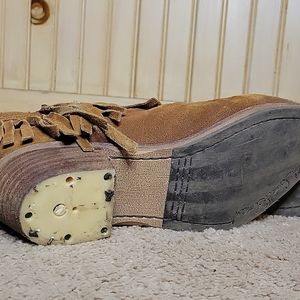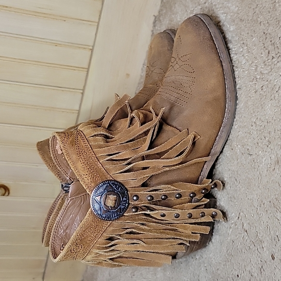 very cute booties. fringe and real leather. barley worn. the only downfall is the heels on the soles of these wore out really fast even though barley worn. wanted to get them fixed but have no time.