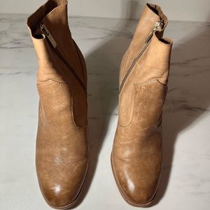 Soft leather, tan booties with side zipper and stacked heel