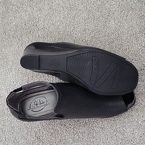 NWOT, Life Stride open toe booties. purchased for an event and never worn. This brand is very comfortable and stylish. The wedge is approximately 2 and 3/4 inches high. The wedge is shiny patent leather. No imperfections but it hard to get a picture that does not look distorted!