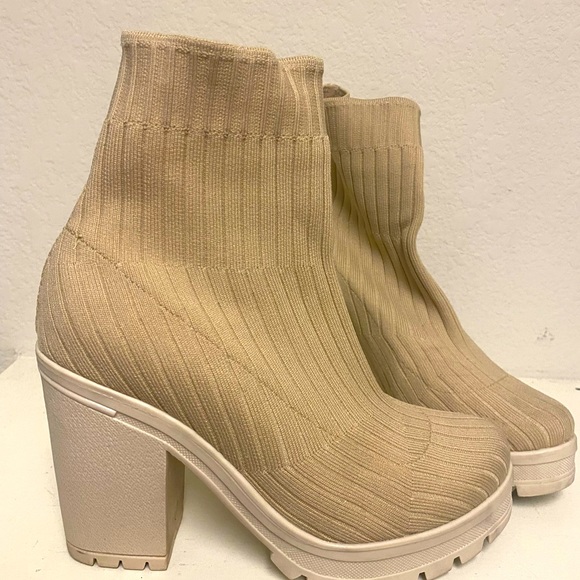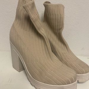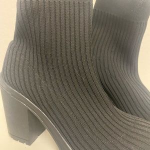 These are so comfy ! Sweater type material . Rubber soles so they aren’t loud when you walk .