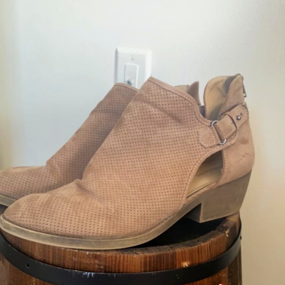 Perfect for Spring! Tan Booties with a cut out bought from Maurices. Super cute and comfortable just don't reach for them anymore. Small heel with a relaxed look. Level up any casual blouse. Worn very few times.
