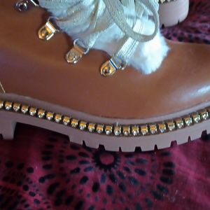 Rhinestones,gold studs,white fur and sparkling gold and white ties this dress this bootie.