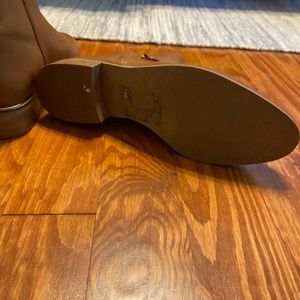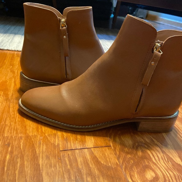 Cognac color booties with gold detail on heel. They’re in great condition and comfortable to wear.
