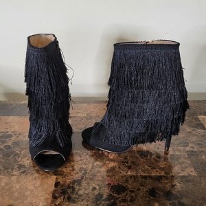 peep toe 5 layer fringe style high heel booties with inner zipper. booties are a Sz. 8, but suggested for a Sz 7½ for a more comfortable fit. They are brand new in box, never worn. The heel is approximately 4.5"