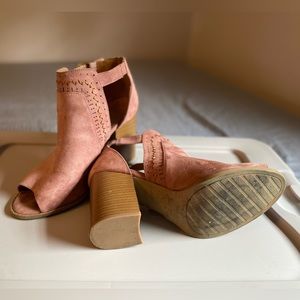 Pink suede ankle booties, open toe, clasp on side, comfortable, size 10