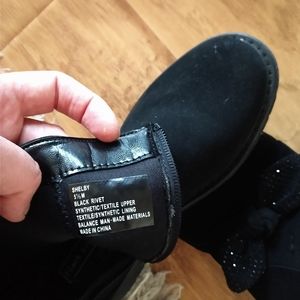 Nice looking kids or adult black booties, rhines stones on the bow,my daughter wore them twice. Clean and ready for a nice Christmas outfit.