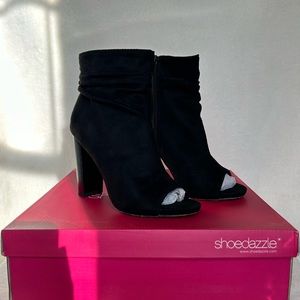 Gentle ruching gives a stylishly slouchy look to an on-trend bootie with a flirty peep toe. Faux suede. Comfortable and supportive heels. Worn once. May show a few marks but overall great condition.