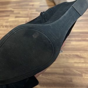 Black suede booties. Worn conditions. About 2 in. Heel.